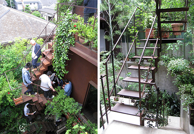 これも、折板サンドイッチパネルによるモノコック構造。すべてのパネルが全溶接で一体化され防水も不要、屋上庭園の植栽も鉄の箱そのままのなかに。サッシもコールテン鋼でつくるという徹底された美学。