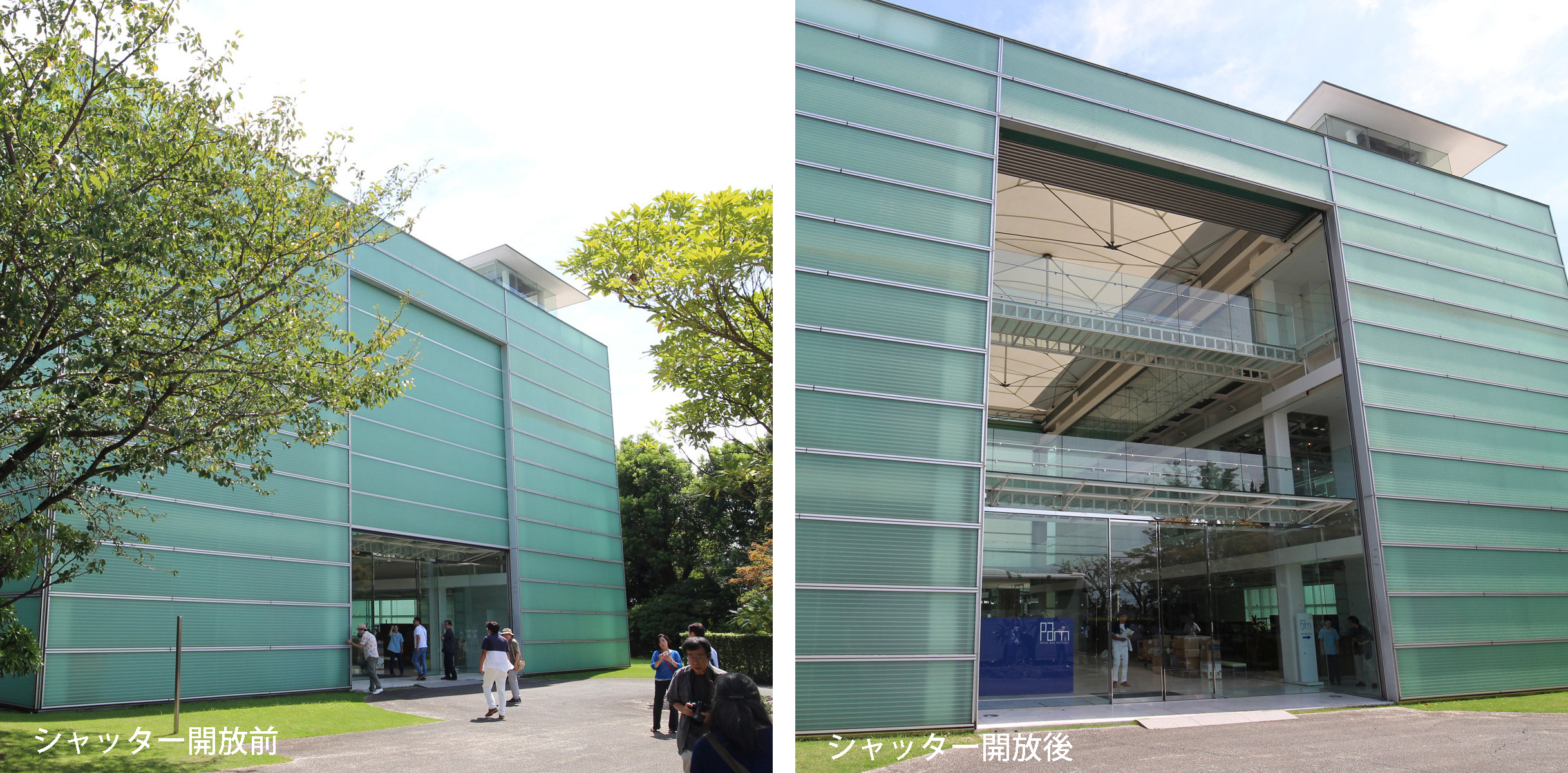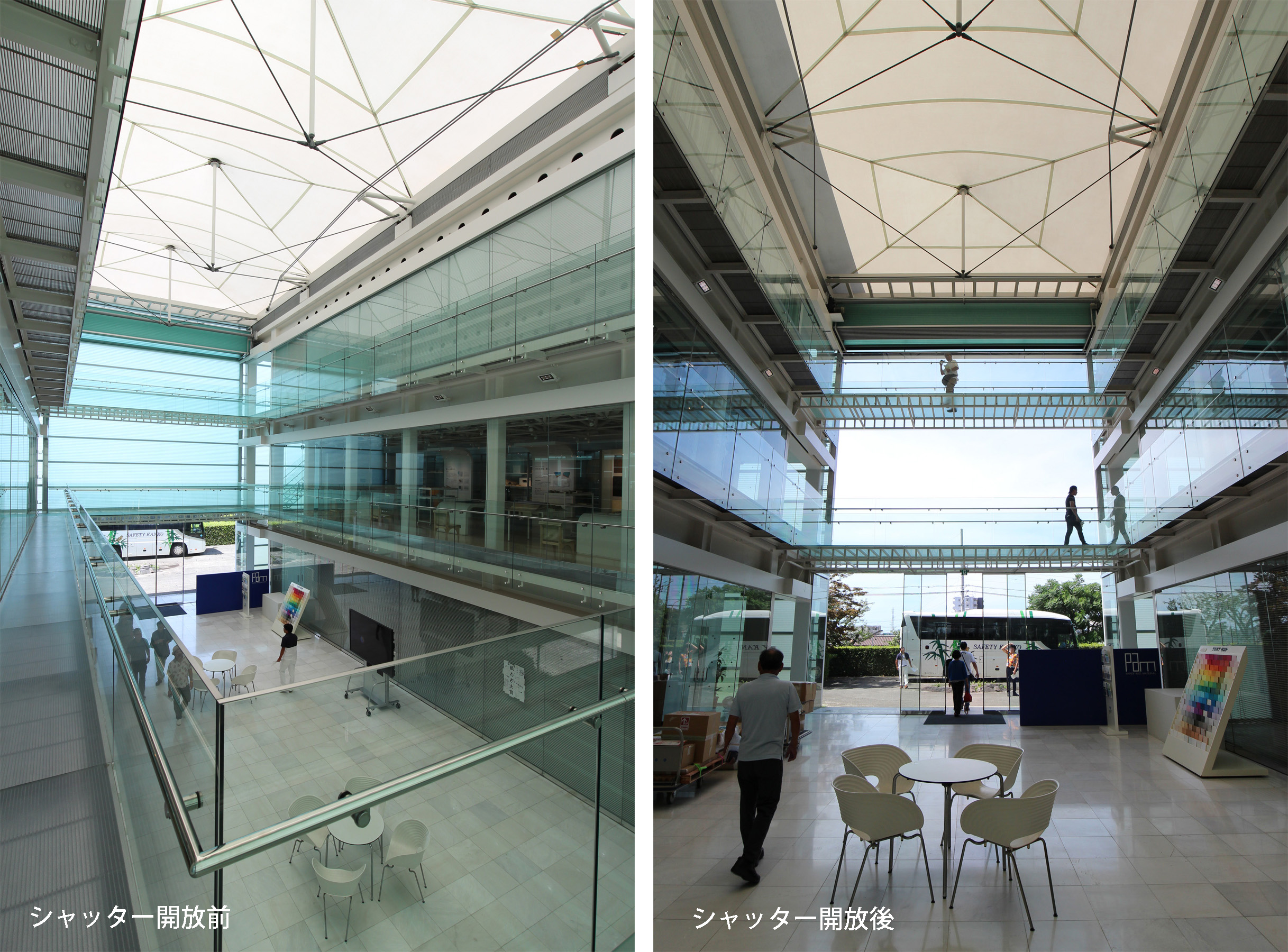 3層吹き抜けのアトリウムの東西面は、FRP製のスタッキング・シャッターで開閉可。