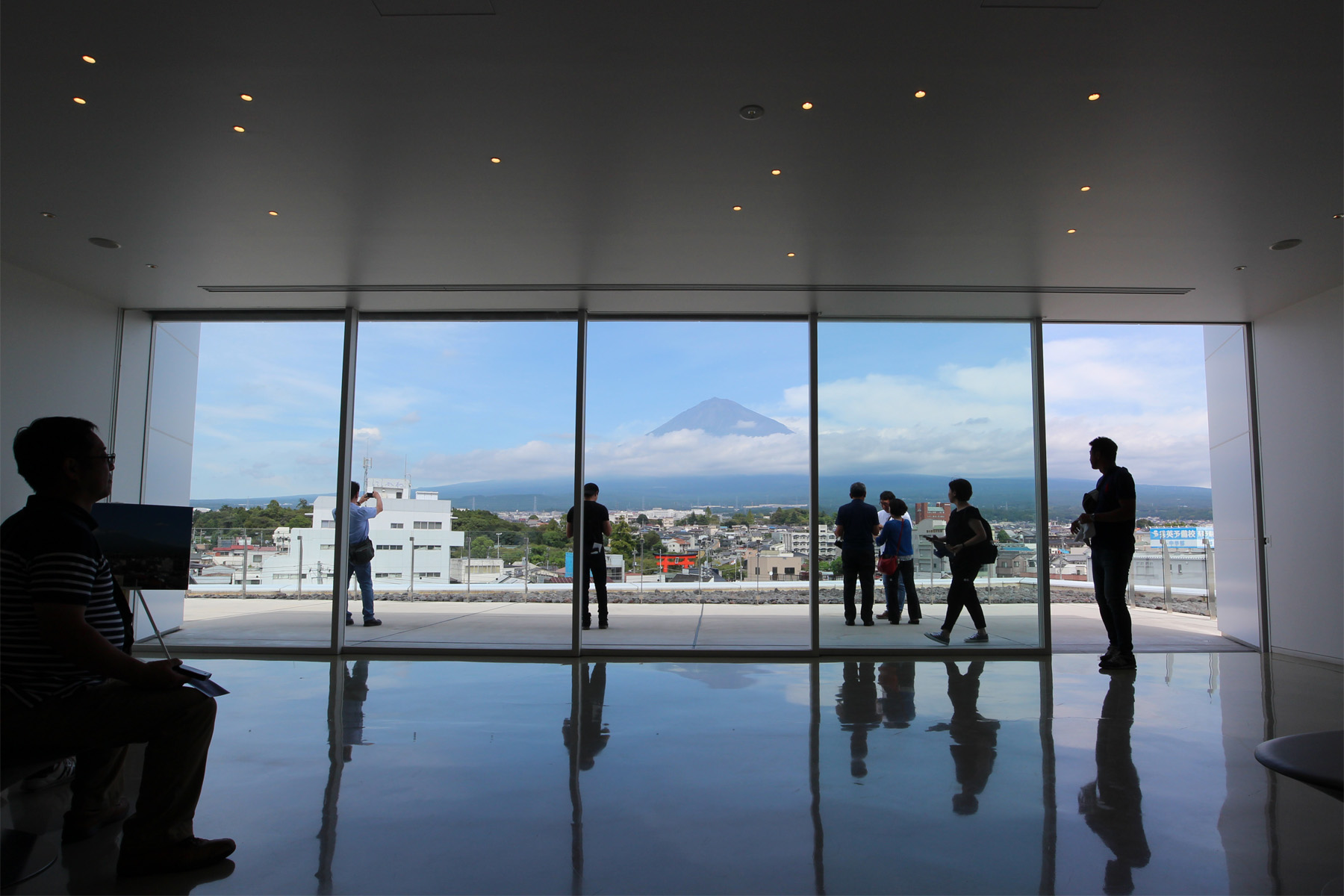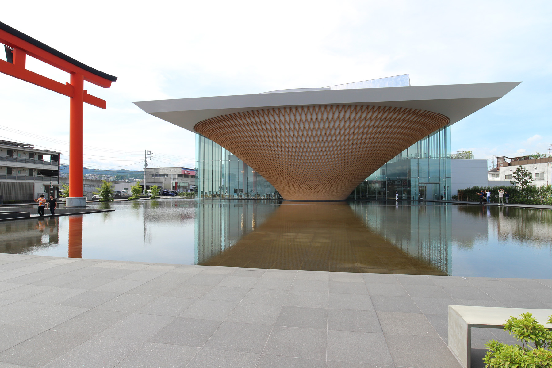 木格子の外壁を持つ“逆さ富士”の建物が、水盤に映り込むと“富士山”の姿が現われる。