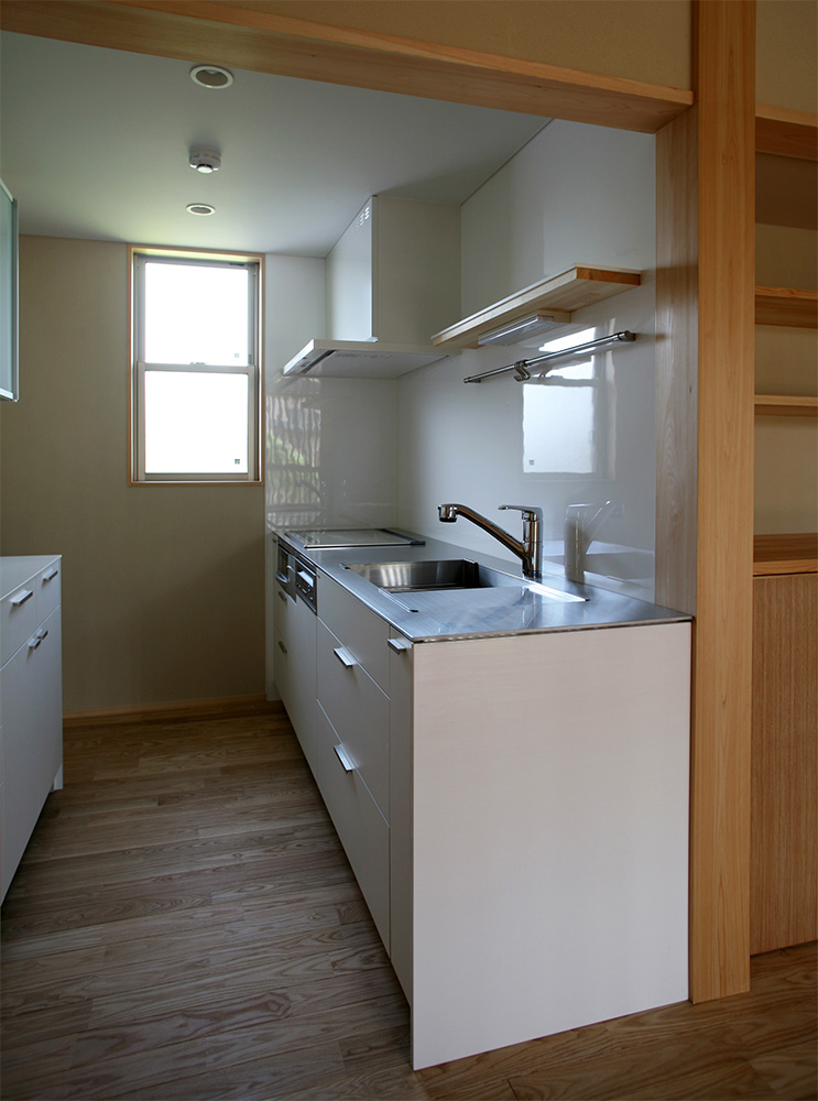 KitchenHouse による オーダーキッチン。白の箱とステンレスのシンプルなデザインに。