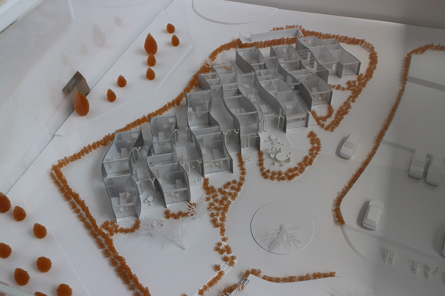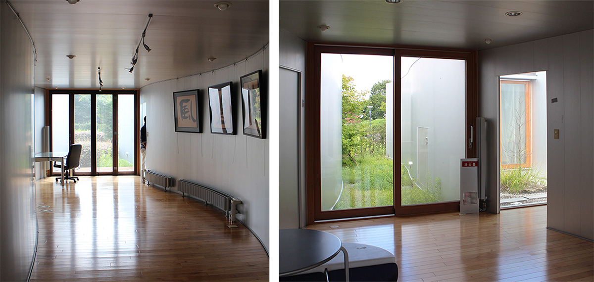 各ユニットは、アルミ湾曲壁で仕切られていて、ところどころに中庭を取り込んでいます。