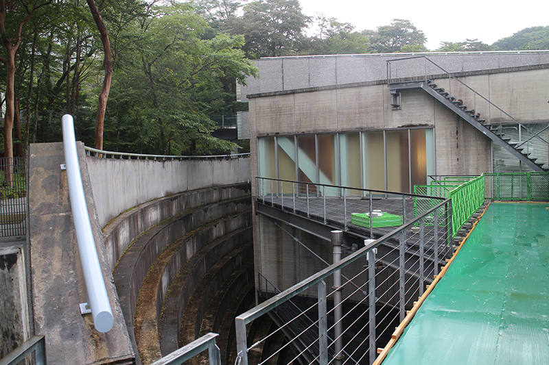 以下アモルフのHPより、「国立公園に新たな景観を生む出すべく、環境庁と6ヶ月にわたる協議を経てできあがった和風旅館。傾斜面に沿って大地に近い和の空間が積み重ねられ、尾根筋に120mの大列柱廊が走る。・・・記憶に残る風景の創出の試み。」